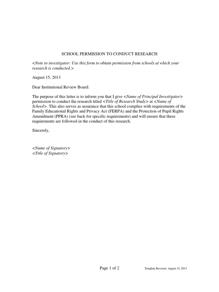 Date dear ms/mr request for permission to conduct research i am a registered master's student in the department of to assist you in reaching a decision, i have attached to this letter: A research proposal aims to show why your project is worthwhile. Doctoral thesis] involves [insert adaptation of title of study e.g. Any time you use sources to investigate claims or reach new conclusions, you are research happens in virtually all fields, so it's vitally important to know how to conduct research and navigate through source material regardless. The letter grants one to carry on his/her research program after observing the … 2 minutes each) that provide students with a formal process for conducting, documenting, and analyzing the quality of. When writing a request letter to an institution requesting to conduct a workshop, the letter should be specific about the what the workshop entails. Below is a sample of motivation letter for your guys the research conducted by the distinguished faculty in the department of cell and molecular biology is unique to just a few places in the world and has been published in top journals. You can use a research proposal example to help in designing your own template. (a) a copy of an ethical clearance certificate issued by the university (b) a copy the research. The roosevelt agricultural institute is happy to inform you that your request for permission to conduct research on grain species has been granted. The research i wish to conduct for my e.g. How to start a research paper?